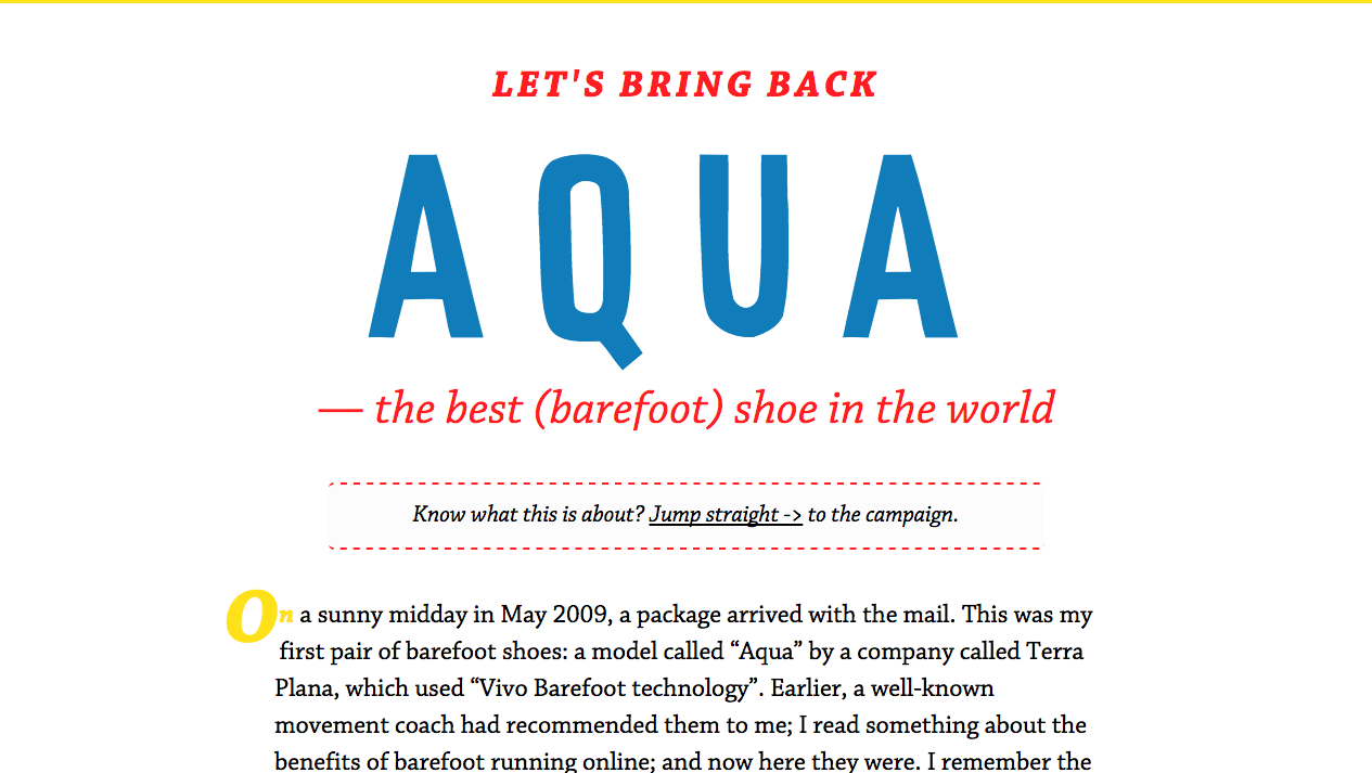 Brief: A viral campaign, supported by Twitter ads, aiming to encourage Vivo Barefoot to start making their iconic barefoot shoe from 2008 once again. The campaign was launched in May 2015, got traction, and by October 2016 Vivo released a new verion of Aqua.